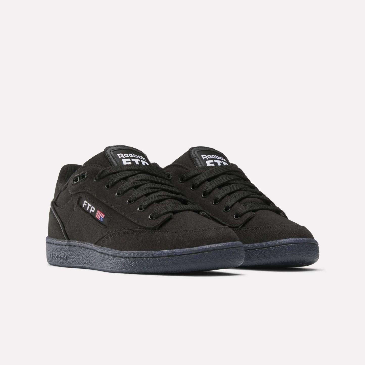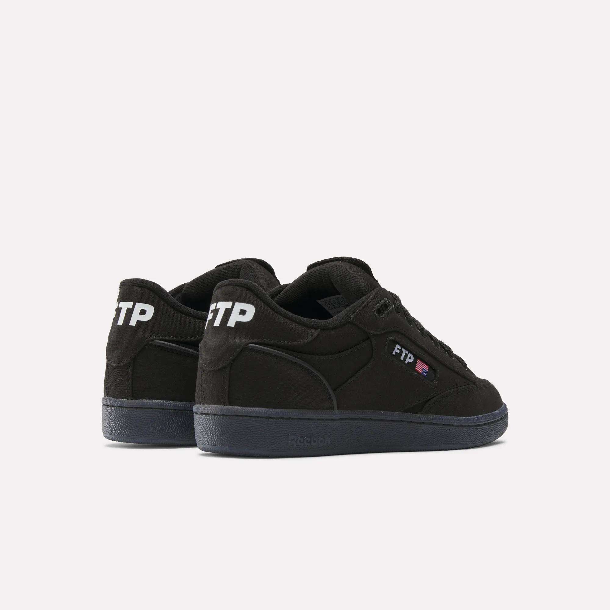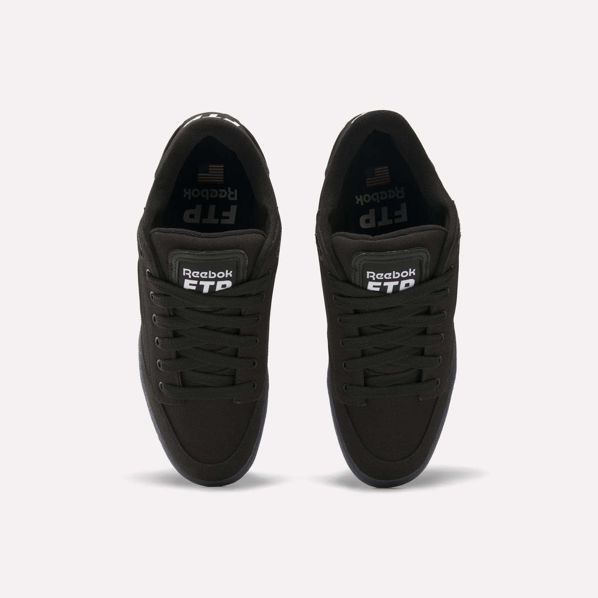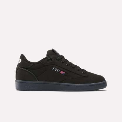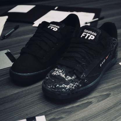 In collaboration with streetwear brand FTP, these shoes reimagine the ultimate Reebok classic. They have a black canvas upper that, with wear and tear, reveals a leather material with an FTP pattern underneath. Custom features, including the tongue heel and footbed, celebrate FTP's daring signature style.
